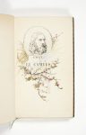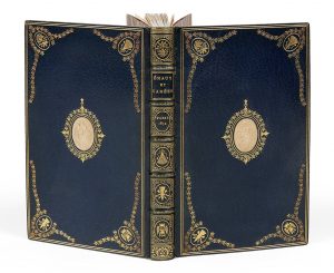 feuillages dorés dans les angles et, au centre, camée d'après l'antique avec sujet féminin formé d'une empreinte en mastic vieux rose insérée dans un ovale évidé serti d'un double filet et d'une guirlande dorée formant pendentif, coupes filetées or, doublures de maroquin rouge encadrées de filets et dentelle dorés, avec au centre une branche de feuillage au naturel dorée, tranches dorées sur témoins, couverture conservée (Chambolle-Duru).