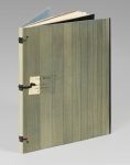 encadrées de rivets d'ébène en tête et en pied, plats souples en onze lames articulées de bois d'aniégré teinté en bleu pâle bordés en gouttière d'une baguette de bois d'ébène, étiquette de titre incisée sur le premier plat, avec pièce de peau de truie, imitant un cahier d'écolier, ornée d'une petite pièce en bois d'ébène sculpté en forme de pie, doublures de nubuck bleu cendré, gardes de papier noir, couvertures de toile écrue illustrée conservée, étui-chemise en demi-box gris perle (Jean de Gonet, 1982).