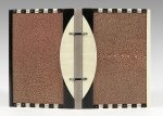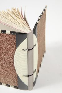en ébène, entrecoupé d'une large pièce d'ivoire semi-ovale striée, petits carrés d'ébène et d'ivoire cousus en tête et en pied, doublures de nubuck rose et crème, couverture et dos conservés, boîte en demi-box mastic (Jean de Gonet, 1990).