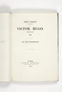 HUGO (Victor). Les Voix intérieures. Paris, Eugène Renduel, 1837. In-8 [218 x 150 mm] de XIV pp., (1) f., 320 pp. : maroquin noir souple à la Bradel, dos lisse et plats ornés d'un filet à froid d'encadrement, avec points dorés aux angles,...