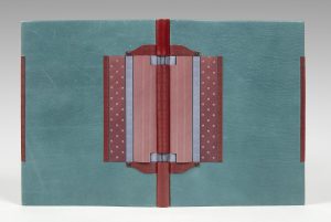 veau bleu gris gaufré “petits carrés”, plats de maroquin turquoise souple, pièce de veau vieux rose à rainures en relief et rectangles de veau rouille et bleu gris gaufrés, bande de veau rouille gaufrée “petits carrés” en bordure de gouttière, doublures de nubuck rose, non rogné, couverture et dos conservés, boîte en demi-box rouille (Jean de Gonet, 1991).