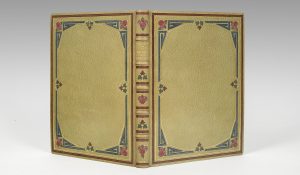de fleurs, feuilles et listels mosaïqués de maroquin de plusieurs teintes, encadrement de filets or et de listels de maroquin brun et bleu, avec fleurs aux angles et feuilles au centre, mosaïqués de maroquin rouge, rose, vert et marron, coupes filetées or, doublures de maroquin mastic ornées d'un encadrement de listels bruns, entrecoupés d'une composition angulaire mosaïquée de maroquin mauve, rose et bordeaux, gardes de moire vert gris, tranches dorées, chemise, étui (P. Affolter, A. Cuzin).