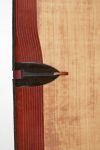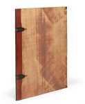 (252 x 291 mm) : demi-requin noir, couture sur deux lanières de veau roux gaufré “petits carrés”, pièces d'attache d'ébène, mors recouverts de buis teinté incisé, plats souples de veau blanc teinté en brun doré, angles de buis avec barrettes d'ébène, doublures de nubuck caramel, couverture illustrée en parchemin conservée, boîte de demi-box crème (Jean de Gonet).