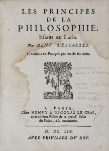 *** DESCARTES (René). Les principes de la philosophie escrits en latin… et traduits en françois par un de ses amis [l'abbé Picot]. Paris, Henry et Nicolas Le Gras, 1659, in-4, [27] f. (dont titre, préface et table), [1] f. blanc, 477 p., [1] f....