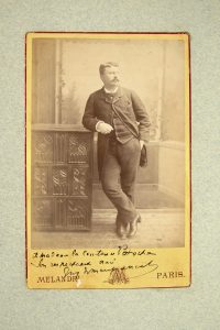 — Portrait photographique de l'écrivain en pied, réalisé par Achille Mélandri, hydropathe et voisin de Maupassant au 19 rue Clauzel. Sans date [1883]. Épreuve montée sur carton.
