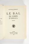RADIGUET (Raymond). Le Bal du comte d'Orgel. Roman. Paris, Bernard Grasset, 1924. In-12 [187 x 128 mm] de XV pp., 240 pp. la dernière non chiffrée : demi-veau noir gaufré vermiculé, coutures apparentes sur veau noir “à grain”, mors...