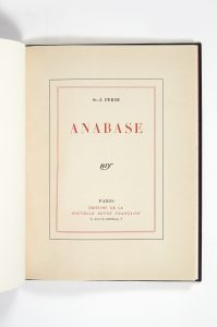 SAINT-JOHN PERSE. Anabase. Paris, Éditions de la Nouvelle Revue Française, 1924. In-4 [279 x 210 mm] de (28) ff. dont 1 blanc : demi-veau noir, titre en long sur dos lisse, bordure de veau de même teinte sur les plats, non rogné, tête...
