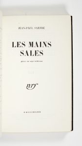 SARTRE (Jean-Paul). Les Mains sales. Paris, Gallimard, 1948. In-12 [188 x 113 mm] de 260 pp. la dernière non chiffrée, (2) ff. : maroquin noir, dos lisse, grandes pièces rectangulaires de daim ornées d’un réseau de bandes de papier laqué...