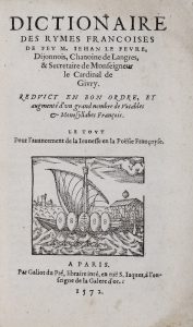 *** [Livres du XVIe s.]. LE FEVRE (Jean, 1493-1565, chanoine de Langres). Dictionnaire des rymes françoises de feu M. Jehan Le Fèvre,… réduict en bon ordre, et augmenté d'un grand nombre de vocables & monosyllabes françois… A Paris, par...