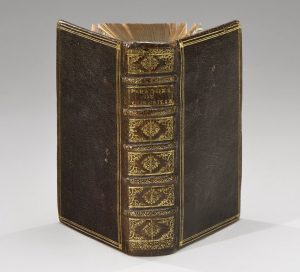Dos à 5 nerfs cloisonné et fleuronné portant le titre doré, triple filet d’encadrement doré sur les plats, roulette dorée sur les coupes, tranches dorées. Tête un peu courte.