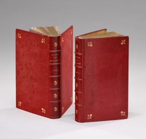 d’une fleurette dorée entre les nerfs, même fleurette dorée installée dans les angles des plats. Filets dorés sur les coupes, dentelle intérieure dorée, tranches dorées sur marbrure.