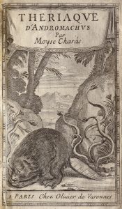 → Édition originale ornée d’une superbe page de titre gravée, illustrée d’un castor et de vipères. Moyse Charas, “savant apothicaire”, ouvrit une officine à l’enseigne “Aux vipères d’or” dans le faubourg Saint Germain à Paris avant d’être nommé par Antoine d’Aquin en 1671 comme sous-démonstrateur de chimie au Jardin du Roy.