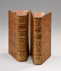 Dos à 5 nerfs cloisonnés et fleuronnés portant les pièces de titre en maroquin rouge et de tomaison en maroquin vert, filet doré sur les coupes, tranches rouges.
