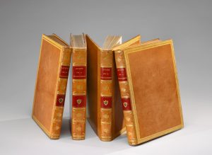 Dos lisses ornés de palettes dorées portant les pièces de titre et de tomaison en maroquin rouge, large guirlande dorée autour des plats, filets dorés sur les coupes, chasses décorées et dorées, tranches dorées. Petit accroc à une coiffe.