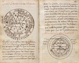 → Manuscrit joliment calligraphié à l’encre rouge ou noire, réglé d’un filet rouge, et illustré de 66 pentacles et de nombreux tableaux, carrés magiques, sceaux et symboles ésotériques. Une table des chapitres et des matières qui sont contenues dans les Clavicules de Salomon, déclarée “fauce” a été supprimée par découpe de 4 feuillets, seule la première page subsiste, barrée à l’encre, et portant l’inscription “elle est fauce”.