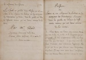 Le manuscrit, anonyme, est d'une seule main, avec quelques ratures, passages soulignés et corrections. En haut du f.2 se trouve la mention " Ms inédit de Toland ", vraisemblablement d'une autre main, et au verso " Imprimé à Londres en 1704 ", les 2 premiers mots grattés. Chaque partie est composée de paragraphes numérotés, comme dans l'édition publiée, à savoir : Préface, 17 paragraphes ; Lettre 1, 14 ; Lettre 2, 17 ; Lettre 3, 22 ; Lettre 4, 18 ; Lettre 5, 31.
