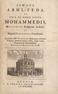 ABU'L-FEDA (Ismael). De vita, et rebus gestis Mohammedis, moslemicae religionis auctoris, et imperii… Ex codice… Joannes Gagnier. Oxonii, e theatro Sheldoniano, 1723, in-folio, [4] f. (faux-titre, titre, dédicace à Thomas, comte de...