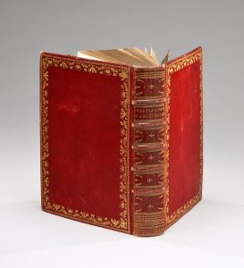 ff., puis du feuillet 245 au f. 300, pleine reliure ancienne en maroquin rouge. Dos à 5 nerfs cloisonné, décoré et doré portant le titre doré, dentelle dorée autour des plats, filets dorés sur les coupes, dentelle dorée sur les chasses, tranches dorées. Très légers frottements.