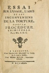 Plaidoyer contre la torture, argumenté de nombreux exemples et citations historiques. Bon exemplaire de la seconde édition. (Barbier II, 236).