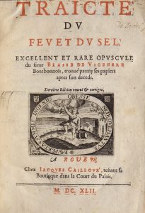 VIGENERE (Blaise de). TRAICTÉ DU FEU ET DU SEL. Excellent et rare opuscule du Sieur Blaise de Vigenere Bourbonnois, trouvé parmy ses papiers apres son deceds. Dernière édition revue & corrigée. A ROUEN, Chez Jacques CAILLOVE, 1642. Un...
