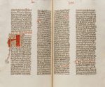 Titres courants, rubrication et très nombreuses initiales ornementées à l’encre rouge.