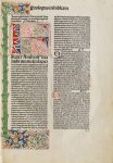 ►Superbe initiale de départ peinte en rouge, bleu et bistre, accostée marginalement d’une longue tige verte qui se déploie dans la marge supérieure et inférieure en de gracieux motifs floraux.