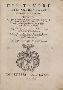 BACCI (Andrea, 1524-1600). Del Tevere… libri tre, ne' quali si tratta della natura, & bontà dell'acque, & specialmente del Tevere, & dell'acque antiche di Roma, del Nilo, del Pô, dell'Arno, & d'altri fonti, & fiumi del mondo. In Venetia, [Aldo...