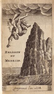 Ouvrage singulier, avec un curieux frontispice gravé : un homme tombant les jambes en l’air, mais retenu par une main divine.