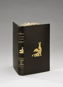 Dos à 4 nerfs décoré d’un fer doré, roulette dorée sur les nerfs et titre doré, filet d’encadrement à froid sur les plats, le premier orné d’un large fer doré, tranches jaspées.