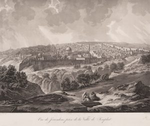 avant-propos), 460 p. - Atlas : 78 planches (dont 72 lithographiées par Engelmann, et 6 planches d'après les dessins de l'auteur gravées à l'aquatinte par Debucourt : pl.49 à 51 et 62 à 64), et 2 planches gravées sur acier (dont un plan du Saint-Sépulcre), soit un total de 80 planches ; reliure du texte époque demi-basane fauve à petits coins, dos lisse (mors fendu, dos décollé, couture solide ; il manque la carte dépl., la garde inf. et le frontispice, int. frais), reliure de l'atlas récente, demi-basane noire à coins, dos lisse, titre doré en long (rousseurs généralement marginales, déch. sans perte sur 5 cm en marge pl. 43, la pl. 15 fortement brunie).