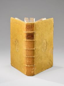 Dos à 5 nerfs portant une pièce de titre en maroquin vieux rouge, filet doré d’encadrement sur les plats.