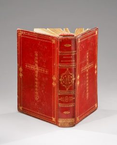 riche encadrement doré sur les plats qui présentent, chacun, une grande croix décorée et dorée, dentelle intérieure dorée, tranche dorées occupées par les divers rubans des différentes couleurs sacerdotiques.