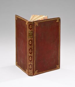 Dos lisse cloisonné et fleuronné portant une pièce de titre en maroquin brun, triple filet d’encadrement doré sur les plats avec fleurons dorés dans les angles, filet doré sur les coupes, tranches dorées. Petite usure sur un coin.