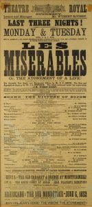HUGO. Les Misérables.  AFFICHE. Théâtre Royal Guernsey. Lessee and Manager Mr Wybert Rousby. Last three nights ! Monday & Tuesday April 6 & 7 1868, will be produced a New Grand Sensational Drama, of intense interest, in 4 Acts and a...