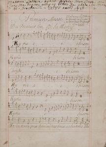 havane à coins, dos à 5 nerfs, titre doré, double filet doré aux plats, ceux-ci couverts d'un élégant tissu brodé de fleurs (qq. salissures ordinaires dûes à l'usage, bien relié, bon état). Précieux livre de chant, dont l'usage est attribué par le comte de Palys (note détaillée sur un f. liminaire), à Magdeleine Clotilde de La Bourdonnaye de Clermont. Fille de François Marie de La Bourdonnaye de Liré, conseiller au Parlement de Bretagne, elle dirigea l'abbaye de Saint-Sulpice (actuelle St-Sulpice-la-Forêt), de juin 1755 à 1776. Il n'y a pas de page de titre, mais une table sur le f. précédent le texte, où 34 messes ou credo sont signalés. Manuscrit entièrement constitué de musique notée, avec les textes des chants ligne à ligne. On peut lire une mention manuscrite en marge du premier f. de musique : " Madame l'abbesse ayant préféré mon livre au sien ma donnez celuy ci dans la place du mien, Sr De Brecheu, ce 8 avril 1758 ".