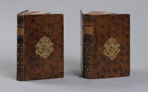 Brunet, 1760-1762, 2 vol. in-8, frontispice gravé sur cuivre par Baquoy, XXXVIII-38- 284 p., [3] f., 2 planches et un bandeau gravé + VIII-392 p., [1] f., 1 planche, armes des États de Bretagne gravées à chaque titre, reliure d'époque veau havane moucheté, dos à nerfs ornés d'hermines et de fleurs de lys alternés, pièce de titre et de tomaison basane fauve et brune, armes des États de Bretagne dorées sur les plats (2 coiffes découvertes, petite fente à un mors, coins émoussés ; qq. salissures marg. au 2e vol.). Ex-libris de la bibliothèque de Clays-Palys et Château de Bourbansais. L'exemplaire de la bibliothèque de Rennes est également relié aux armes des États de Bretagne. Rare ensemble.