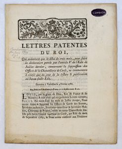 Importante réunion de textes législatifs relatifs à la Corse provenant de la bibliothèque du prince Roland Bonaparte, avec ex-libris sur le portefeuille et, sur chacune des pièces, le cachet encré Corsica et la mention autographe : Casabianca, 1er juin 1890... # Petit-fils de Lucien Bonaparte, Roland Bonaparte (1858-1924) se distingua comme anthropologue, naturaliste, géographe et explorateur. Il est le père de Marie Bonaparte, princesse de Grèce, psychanalyste amie de Freud. # Détail des pièces : 1. Lettres patentes du roi, qui ordonnent que le délai de trois mois, pour faire la déclaration portée par l'article V de l'édit de juillet dernier, concernant la suppression des offices de la chancellerie de Corse, ne commencera à courir que du jour de la lecture & publication au sceau dudit édit. Données à Versailles le 4 février 1786. Paris, Simon & Nyon, 1786. – 2. Lettres patentes du roi, sur le décret de l'Assemblée nationale, concernant les Corses fugitifs. Données à Paris, le 2 décembre 1789. Paris, Nyon, 1790. – 3. Lettres patentes du roi, sur un décret de l'Assemblée nationale, portant que l’isle de Corse fait partie de l’empire françois. Données à Paris, au mois de janvier 1790. Ibid., 1790. – 4. Loi portant que la Corse ne forme qu’un seul département. Donnée à Paris, le 19 novembre 1790. Ibid., 1791. – 5. Loi relative aux doctrinaires de la ville de Bastia, & au Directoire du district de la même ville. Donnée à Paris, le 18 février 1791. Paris, Imprimerie royale, 1791. – 6. Loi relative à la Gendarmerie du département de Corse. Du 8 juin 1791. Ibid., 1791. – 7. Loi relative aux troubles de la Corse, & qui autorise provisoirement les départemens & l'évêque à tenir leurs séances dans la ville de Corte. Donnée à Paris, le 28 juin 1791. Ibid., 1791. – 8. Loi relative aux concessions des domaines nationaux de l'isle de Corse. Donnée à Paris, le 12 octobre 1791. Ibid., 1791. – 9. Loi relative au terrier général de l'isle de Corse. Donnée à Paris, le 19 octobre 1791. Ibid., 1791. – 10. Loi relative au payement des troupes employées dans l'isle de Corse. Donnée à Paris, le 9 mai 1792. Ibid., 1792. – 11. Loi relative au payement des dépenses de l'ancienne administration [...] de l'isle de Corse. Donnée à Paris, le 1er juillet 1792. Ibid., 1792. – 12. Loi relative aux frais faits pour la vente & estimation des biens nationaux dans l'isle de Corse. Donnée à Paris, le 22 juillet 1792. Ibid., 1792. – 13. Loi relative à la révocation du bail emphytéotique de plusieurs domaines nationaux du département de la Corse. Du 2 septembre 1792. Paris, Imprimerie nationale du Louvre, 1792. – 14. Décret de la Convention nationale, du 11 février 1793 [...], qui proroge de six mois le délai pour se pourvoir en cassation par les habitans du département de Corse. Ibid., 1793. – 15. Décret de la Convention nationale, du 8 mars 1793 [...], relatif au payement du traitement des ci-devant employés de la Régie des domaines & droits de l'isle de Corse, & qui accorde un secours aux employés sous les ordres du ci-devant intendant. Ibid., 1793. – 16. Décrets de la Convention nationale, du 23 mai 1793 [...], relatifs aux troubles de l'isle de Corse. Ibid., 1793. – 17. Décret de la Convention nationale, du 27 mai 1793 [...], qui déclare citoyen François, Philippe Buonarroti, natif de Toscane. Ibid., 1793. – 18. Décret de la Convention nationale, du 1er juillet 1793 [...], relatif aux troubles du département de Corse. Ibid., 1793. – 19. Décret de la Convention nationale, du 11 juillet 1793 [...], qui accorde des secours provisoires aux citoyens corses réfugiés, & autres qui ont souffert des dommages de la part des rebelles. Ibid., 1793. – 20. Décret de la Convention nationale, du 17 juillet 1793 [...], qui déclare Pascal Paoli traître à la République, le met hors la loi ; porte accusation contre plusieurs Corses, & ordonne des mesures de sûreté pour ce département. Ibid., 1793. – 21. Décret de la Convention nationale, du 11 août 1793 [...], qui divise l'île de Corse en deux départemens. Ibid., 1793. – 22. Décret de la Convention nationale, du 22 août 1793 [...], relatif au délai accordé pour se pourvoir en cassation contre les jugemens rendus par les tribunaux de la Corse. Ibid., 1793. # On joint : Décision du Conseil des prises, du 4 messidor an X [23 juin 1802], entre Sébastien Furiani et Nicolas Semidei, armateurs de Bastia. S.l., [1802]. Le litige concerne notamment la vente des prises du corsaire Le Bonaparte.
