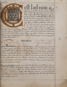 papier), écrit au r° et v°, très lisible, réglé en noir, et débutant par une superbe lettrine peinte et dorée (armoiries des Botherel (10 ancolies), cernées d'un collier, dans une lettre " C "), reliure de l'époque pleine basane fauve, dos à 4 nerfs, caissons ornés, plats richement décorés d'un médaillon central, double encadrement d'une double roulette et de fleurons angulaires, le tout doré, tranches dorées (coins émoussés, plats épid. avec qq. mq. de dorure, liens de fermeture absents mais jolie reliure, gardes renouvelées ; qq. marges un peu jaunies mais le vélin est bien blanc). Aveu présenté par Pierre Botherel, héritier de Jullien Botherel, vicomte d'Appigné, Montigné et autres terres. Ce précieux document décrit en détail les terres qui constituent ce fief ; en page 2 se trouve une table détaillée. Signature de Pierre Botherel aux 2 dernières pages. Est relié à la fin un f. de parchemin, avec sceau à sec " Extrait des degrés de la Chambre des comptes de Bretagne… ", daté de 1625, signé Boylesve (froissé et déchiré sans manque). Ex-libris de la bibliothèque de Clays-Palys.
