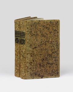 Édition originale. # D'abord publié en feuilleton, entre 1778 et 1780, dans la Correspondance littéraire de Grimm, Jacques le Fataliste fut ensuite édité en traduction allemande, dans la version de Schiller en 1785 et dans celle de Mylius en 1792, et fit l'objet d'éditions françaises retraduites de l'allemand et tronquées. # Le texte original de Diderot ne fut édité qu'en 1797, sur une copie manuscrite provenant vraisemblablement de la bibliothèque de Grimm, et connut plusieurs éditions la même année. # Reliure un peu épidermée, léger manque au plat supérieur du premier volume. Le dernier feuillet blanc du tome I n'a pas été conservé. # Adams, II, 179 : JF1 – Tchemerzine, II, 965.