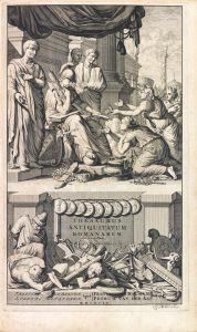 Édition originale de cet ouvrage monumental et peu commun sur les antiquités romaines. # L'ouvrage traite des auteurs anciens, des lois et coutumes civiles, de la topographie de Rome, etc., mais aussi, dans les tomes VI à XII, de la vie civile et quotidienne dans la Rome antique : les vêtements, la division du temps, les poids et mesures, la famille, les dignités, les jeux du cirque, le théâtre, les triomphes, les fastes, les thermes, les rites funéraires, etc. # Importante illustration comprenant plus de deux cents planches gravées sur cuivre. # Sans les suppléments de Sallengre, Gronovius, Pitiscus, etc. Reliures usagées, rousseurs et menus défauts intérieurs. # Brunet, II, 1689 – Graesse, III, 128.