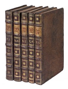 Belle édition, peu commune, illustrée d'un frontispice de Bernard Picart, d'un portrait de l'auteur gravé par Picart d'après Hyacinthe Rigaud et de 238 figures à mi-page gravées à l'eau-forte par Hendrik Causé, imitées des vignettes de François Chauveau pour l'édition parisienne de 1678. # Exemplaire élégamment relié à l'époque en cinq minces volumes. # Habiles restaurations aux reliures, quelques taches et rousseurs, coupure marginale au titre. # Rochambeau, Fables, n°67 – Cohen, 547.