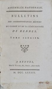 *** Assemblée nationale. Bulletins des correspondances réunies du clergé et de la sénéchaussée de Rennes. Rennes, Vatar, du 1er mai 1789 au 29 septembre 1791, 12 vol. in-8 reliure demi-basane havane, dos lisses. [Puis] Collection des Bulletins...