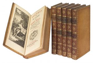 Nouvelle édition, revue et augmentée d'un volume, des œuvres de l'Abbé de Saint-Réal, historiographe de la cour de Savoie. # Elle est illustrée de deux frontispices trois fois répétés, gravés par Coster et Tanjé d'après Du Bourg, six vignettes de titre par Yver, six planches de médailles par Coster, une figure de Mignard et un portrait gravés par Coster, ainsi que vingt-cinq culs-de-lampe. # Séduisant exemplaire en maroquin citron. # Des bibliothèques de Vérigny, Joseph Tasker, Robert S. Turner (1878, n°601), Ferdinand Brunetière (1908, I, n°364), avec ex-libris. # Dos uniformément assombris. # Cohen, 934.