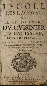 [LA VARENNE (François Pierre de)]. L'Ecole des ragoust, ou le chef d'œuvre du cuisinier, du patissier et du confiturier. Lyon, Jacques Canier & Fleury Martin, 1668. In-12, basane brune, dos orné, tranches jaspées (Reliure de l'époque).