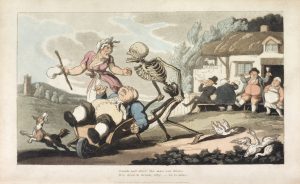 [COMBE (William)]. The English Dance of Death. Londres, J. Diggens pour R. Ackermann, 1815-1816. (2 vol.) – The Dance of Life. Londres, R. Ackermann, 1817. (1 vol.). Ensemble 3 volumes in-8, veau blond, triple filet doré, dos orné, dentelle...