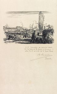 Édition illustrée de 30 compositions gravées sur bois et 4 eaux-fortes d'Auguste Lepère. # Tirage à 695 exemplaires, celui-ci sur vélin fort. # Exemplaire enrichi d'une très rare suite à part des fumés, justifiée ainsi par Lepère : Suite complète en premier état des 30 bois de « La Bièvre, St Séverin... » plus les Ier et 2 ét. des 4 hors texte [signés]. Fumés. Elle contient de plus un tirage des quatre culs-de-lampe. # Il pourrait s'agir d'une des cinq suites des fumés des trente bois de l'ouvrage que cite Carteret. # Carteret Illustrés, IV, 210-211.