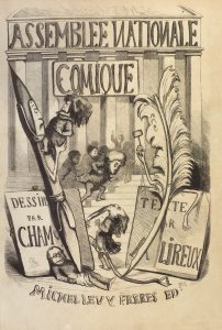 Premier tirage de cet « ouvrage plein de verve et d'esprit », selon Carteret, illustré de 20 figures hors texte et de nombreuses vignettes dans le texte par Cham, gravées sur bois par divers artistes. # Un des quelques exemplaires sur papier vélin fort avec les hors-texte sur chine appliqué cités par Carteret. # Bel exemplaire bien relié par Duru, complet du carton paginé 128 bis–ter et de la couverture générale, qui est illustrée d'un grand bois non repris dans le livre. # On joint la matrice originale du bois de J. Gauchard représentant Victor Hugo, imprimé p. 306 de l'ouvrage. # Deux mors légèrement frottés. # Carteret, III, 390.