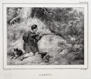 Album contenant 53 lithographies en noir montrant des scènes de chasse, de genre, sujets équestres, etc., signées de F. Grenier (34 pl., dont une suite cynégétique de 12 pl.), Scheffer (4 pl.), , Géricault (9 pl.), E. Lami (3 pl.) et Bonington (3 pl.). # De la collection Frégier, avec mention manuscrite sur une garde. # Une dizaine d'estampes piquées ; une épreuve volante, une autre détachée ; menus frottements à la reliure.