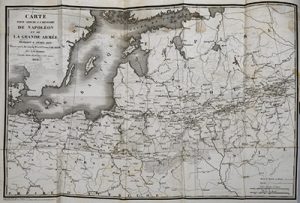 Édition originale, illustrée d'une carte dépliante gravée sur métal d'après A. M. Perrot. # Les exemplaires de premier tirage portent la date de 1824. # Dos légèrement passés et frottés, des rousseurs, réparation à l'adhésif au verso de la carte. # On joint l'ouvrage complémentaire : GOURGAUD (Gaspard). Napoléon et la Grande-Armée en Russie, ou examen critique de l'ouvrage de M. le Comte Ph. de Ségur. Paris, Bossange frères, 1825. In-8, demi-veau fauve, dos lisse orné de motifs dorés et à froid, pièce de titre noire, tranches marbrées (Reliure de l'époque). Seconde édition parue l'année de l'originale. Petit accroc à la coiffe de tête, charnières frottées, quelques rousseurs.