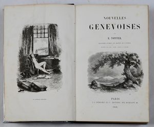 Première édition illustrée, ornée d'un frontispice, 39 planches hors texte et de nombreuses vignettes dans le texte, gravés sur bois d'après Töpffer. # Töpffer a fait retrancher de cette édition un passage que Sainte-Beuve, son conseiller littéraire parisien, trouvait sans doute trivial : le récit à la première personne de Jacques, son domestique, dans la nouvelle L’Héritage.